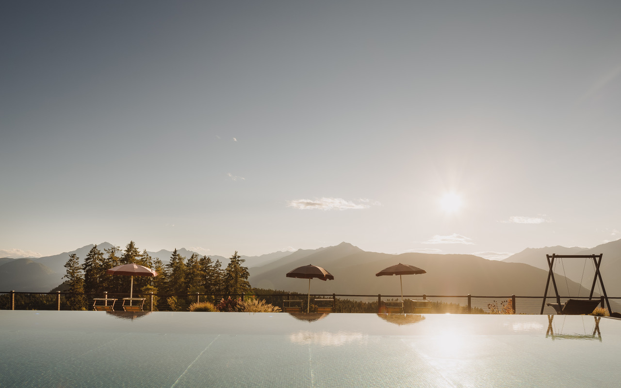Das Spa im Chalet Mirabell ist kein klassischer Wellnessbereich – es ist eine Erlebniswelt. Wasserflächen verschmelzen mit der Landschaft, der Blick schweift scheinbar endlos über die Berge. Besonders der Panorama-Pool wird schnell zum Lieblingsplatz, egal ob am frühen Morgen oder bei Sonnenuntergang.
