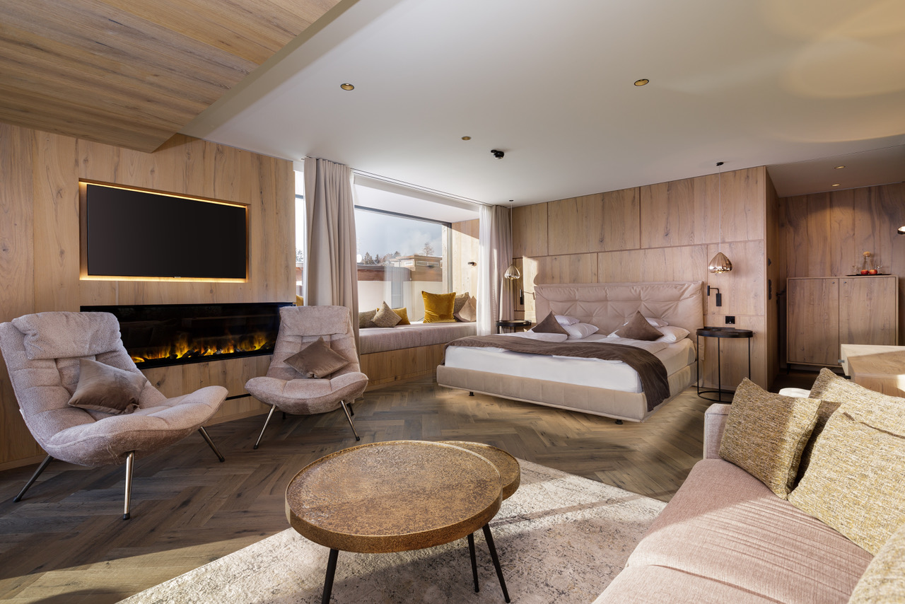 Die Zimmer und Suiten greifen dieses Lebensgefühl auf und übersetzen es in Raum. Natürliche Materialien, warme Farbtöne und ein modernes alpines Design schaffen Orte, die gleichzeitig stilvoll und vertraut wirken. Große Fenster holen die Landschaft nach innen, ohne die Privatsphäre zu verlieren.